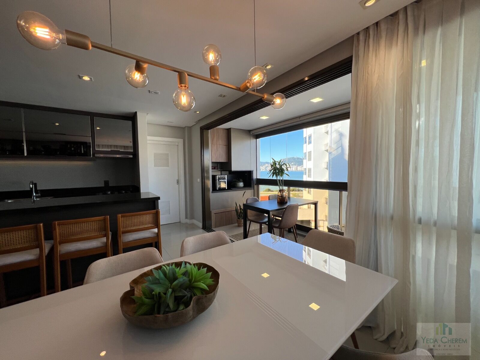 Apartamento de 115 m², com três dormitórios sendo uma suíte, duas demi-suíte, amplo espaço de sala para dois ambientes, varanda com churrasqueira e vista mar, lavabo, cozinha, lavanderia, hobby box e duas vagas de garagem com carregador elétrico.