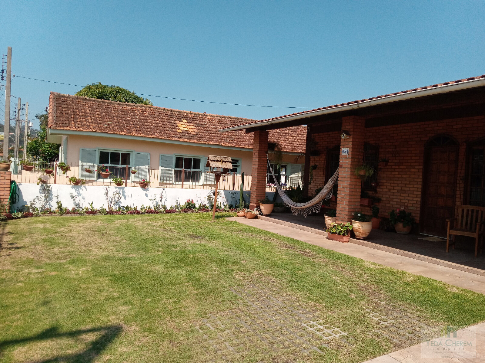 Varanda para frete do imóvel com gramado e jardim