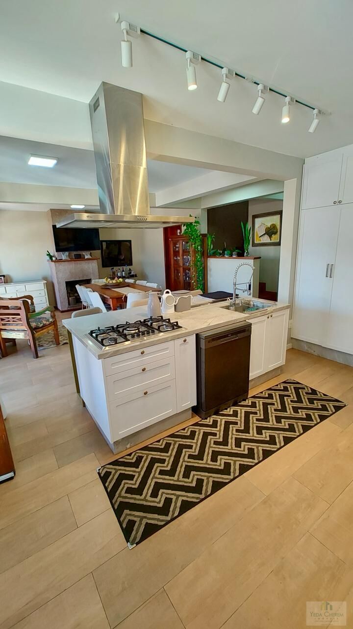 Descendo as escadas, o aconchego se amplia: cozinha integrada à sala de jantar com lareira, sala de TV para momentos de descanso, escritório iluminado com vista para o jardim lateral e mais um banheiro completo.