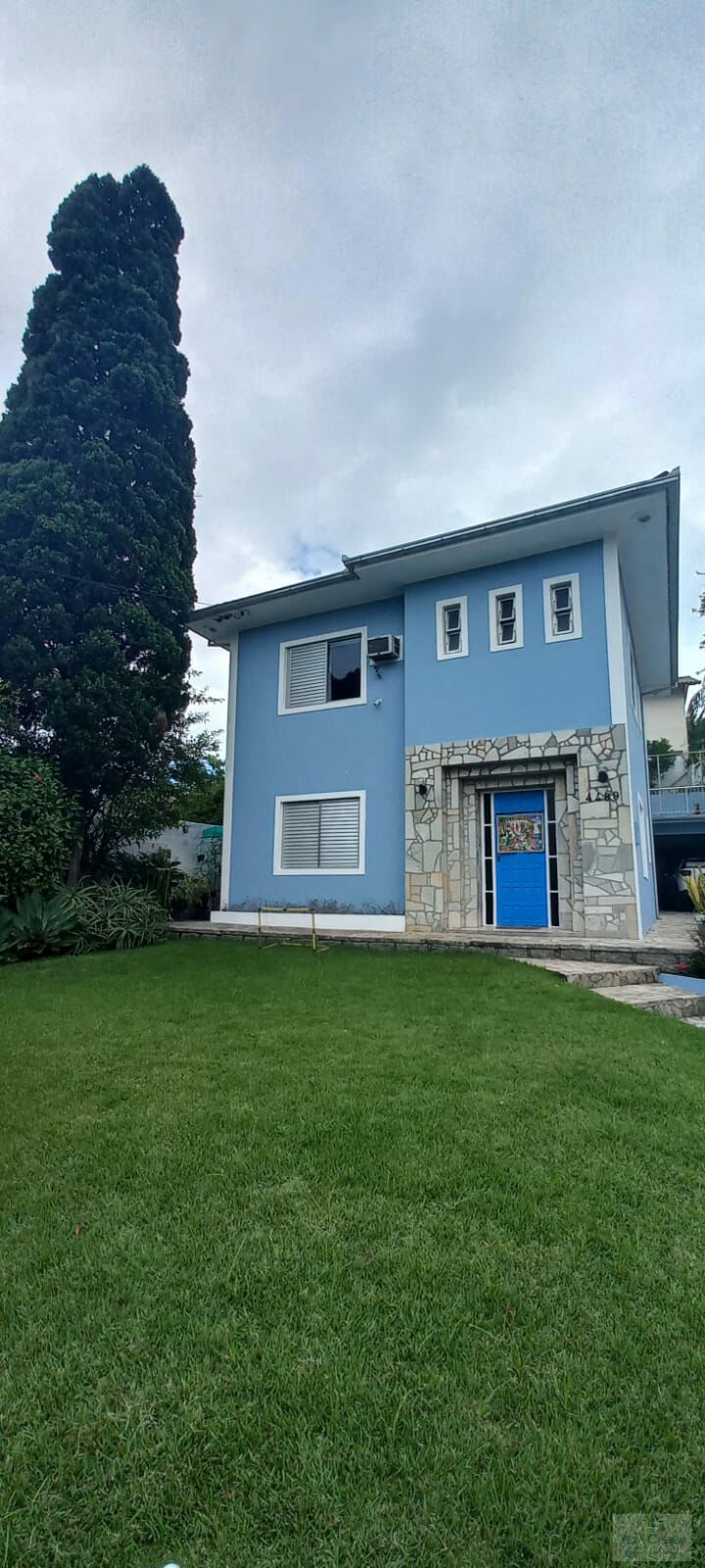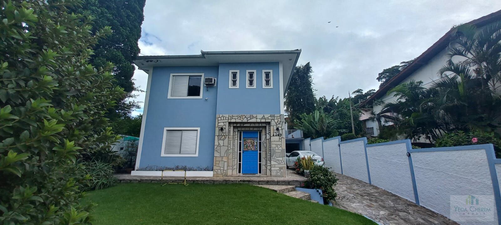 Garagem coberta para 2 carros, piscina, área de serviço e 1 banheiro ao lado da piscina, jardim em frente à casa, terreno com àrea total 510m².